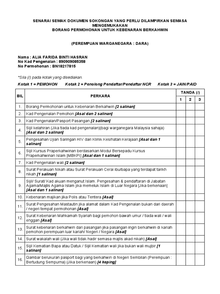 Senarai Semak Permohonan Nikah Perempuan Negeri Sembilan Persona Fiza